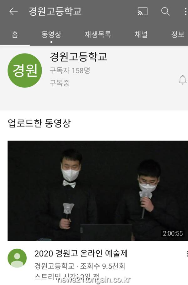 (대구=뉴스21통신) 유재원기자 = 경원고등학교는 2020년 한 해를 마무리하면서 지난 18일(금) 18시 30분부터 약 2시간동안 경원고 계정으로 유튜브에서 실시간 온라인 축제를 했다고 전했다.