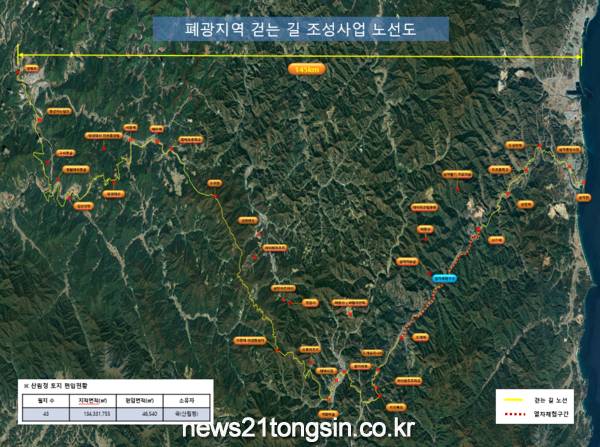 「폐광지역 걷는 길」 조성 사업은, 영월~정선~태백~삼척을 하나로 잇는(線형 관광) 산간‧내륙에서 출발하여 바다를 향해 걷는 동서 횡단길로써 총 145km의 5박 6일 코스로 조성한다.