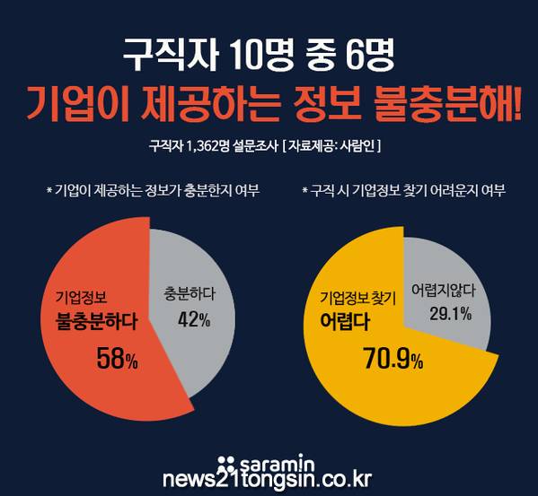 구인구직 매칭 플랫폼 사람인(www.saramin.co.kr 대표 김용환)이 구직자 1,362명을 대상으로 ‘기업정보 파악 및 평판조회’에 대해 조사한 결과 응답자의 58%가 ‘채용을 진행하는 기업이 제공하는 정보가 불충분하다’고 느끼고 있었다.
