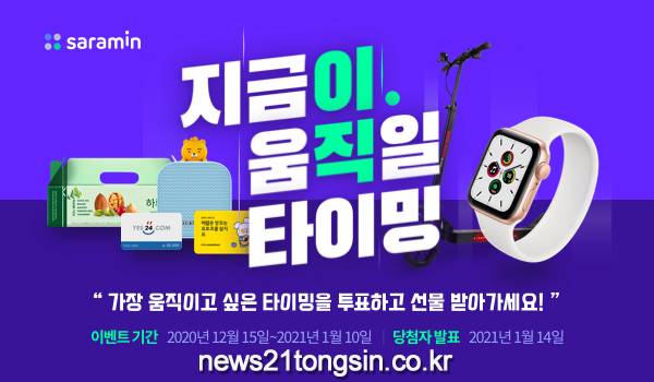 구인구직 매칭 플랫폼 사람인이 연말연초 이직시즌을 맞아 ‘지금이 움직일 타이밍’ 이벤트를 실시한다고 밝혔다.