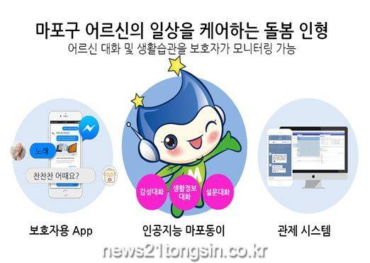 그 밖에 주요 기능은 ▲설문대화 등 치매예방 콘텐츠 ▲인공지능 기술(머신러닝, 딥러닝)을 이용한 개인별 맞춤형 서비스(약복용 시간, 기상 및 취침, 날씨 등) ▲활동감지 등 안전관리 모니터링을 통한 비상상황 응급 연계 ▲마포구 행정 및 복지소식 알림 등이다.