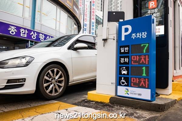 이에 구는 청사 내 주차장 총 54면에 주차 유무 확인이 가능한 무선 차량검지기를 설치하고 실시간 정보를 전송하는 시스템을 구축했다.
