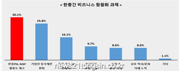 한편, 한중 비즈니스 원활화를 위한 우선과제로 ‘한중FTA, RCEP 활용도 제고(30.1%)’, ‘기업인 입국제한 완화(25.8%)’, ‘물류·운송 등의 원활화(16.1%) 등의 순으로 응답해, 지난달 15일 체결된 역내포괄적경제동반자협정(RCEP) 등 다자·자유무역 채널을 통한 중국과의 경제적 연대 강화에 보다 주력해야 할 것으로 분석되었다.