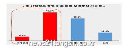 내년 미국 신행정부 출범 이후 미중 무역분쟁이 현재보다 완화(‘완화’45.2%+‘크게완화’6.4%)될 것이라는 응답(51.6%)이 ‘심화(12.9%)’될 것이라는 응답보다 4배가량 높았다. 미중 간 무역분쟁과 이에 따른 보호무역 확산으로 많은 어려움을 겪고 있는 수출기업들에 미국 신정부 출범 이후 미중 무역분쟁 완화 가능성은 다소 긍정적 요인으로 작용할 것으로 보인다.