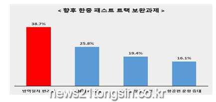 한중 양국은 지난 5.1일부터 패스트 트랙(기업인 입국절차 간소화 제도)을 통해 경제교류를 재개했지만 코로나19 재확산으로 왕래에 여전히 어려움을 겪고 있다. 이에 전문가들은 한중 ‘패스트 트랙’에 대한 보완과제로 ‘방역절차 편리화(38.7%)’, ‘적용지역 확대(25.8%)’, ‘원스톱 창구 마련(19.4%)’, ‘항공편 운항 증대(16.1%)’ 등을 꼽았다.