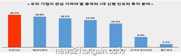 이와 같이 대규모 투자가 전망되는 중국시장에서 우리기업이 어떠한 분야에 관심을 가져야 할지에 대해 전문가들은 인공지능(20.7%), 데이터센터(19.6%), 산업인터넷(18.5%), 5G(17.4%) 순으로 주목해야 한다고 응답했다.