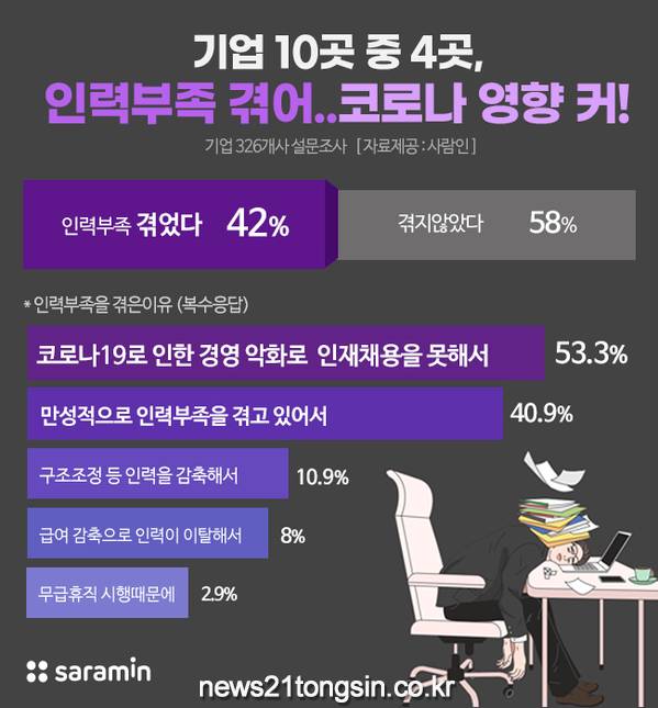구인구직 매칭플랫폼 사람인(www.saramin.co.kr, 대표 김용환)이 기업 326개사를 대상으로, ‘2020년 채용 결산’을 주제로 조사한 결과, 42%가 올해 인력부족을 겪었다고 답했다.