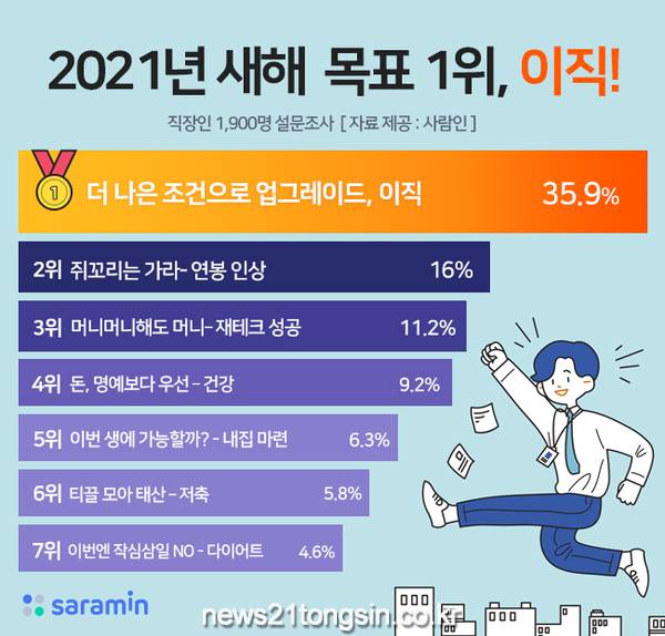코로나19로 뒤숭숭했던 2020년을 뒤로 하고 맞이한 2021년 새해. 직장인들이 꿈꾸는 새해 소망 1위는 무엇일까? 구인구직 매칭 플랫폼 사람인(www.saramin.co.kr 대표 김용환)이 직장인 1,900명을 대상으로 2021년 새해 소망에 대해 조사한 결과, △더 나은 조건으로 업그레이드, 이직(35.9%)이 1위를 차지했다. 작년 코로나19로 채용시장이 얼어붙으면서 이직 계획을 미뤘던 직장인들이 올해는 꼭 이직하기를 소망하는 것.