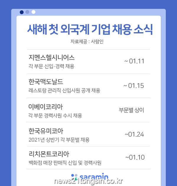 2021년 새해 외국계 기업들이 속속 채용에 나서고 있다. 지난해 코로나19로 세계 경제가 얼어붙었음에도 e커머스, 친환경, 헬스케어 등 유망 분야를 포함한 글로벌 기업들은 성장을 거듭했다. 현재 채용을 실시하는 외국계 기업들도 거대한 규모의 글로벌 본사를 두거나 탄탄한 입지를 다진 업계의 강자가 많아 지원을 적극 고려해볼만 하다. 특히, 국내 인지도는 낮으나 세계적인 위치를 점하는 굴지 기업들도 있어 관심 업종에 진출한 기업을 파악하고 지원하는 것도 좋다. 외국계 기업이라 해도 직무와 업종에 따라 요구하는 외국어 수준이 다르므로 막연히 지원을 꺼리지 않아도 된다. 구인구직 매칭 플랫폼 사람인(www.saramin.co.kr, 대표 김용환)이 새해 눈여겨볼만한 외국계 기업 공고를 정리했다.