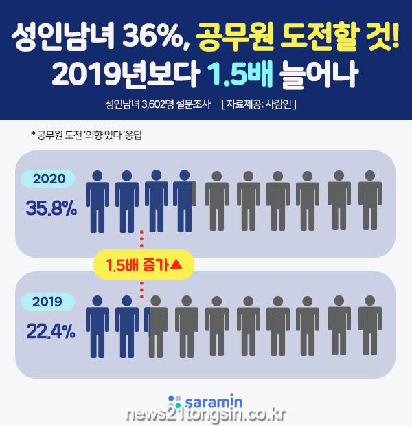 구인구직 매칭플랫폼 사람인(www.saramin.co.kr, 대표 김용환)이 성인남녀 3,602명을 대상으로 ‘공무원 시험 준비 의향’에 대해 조사한 결과, 3명 중 1명 꼴인 35.8%가 현재 공무원 시험을 준비하고 있거나 준비할 의사가 있는 것으로 나타났다.