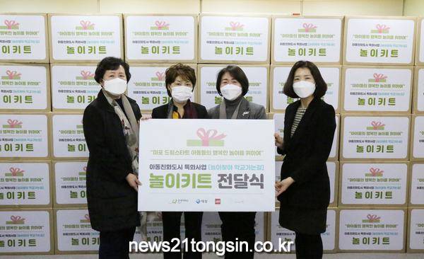 아동친화도시 특화사업 ‘놀이찾아 학교가는 길’의 하나로 진행된 이번 키트 전달을 위해 굿네이버스, 애경산업, 레고코리아, 디자인벗 등 지역사회 유관기관의 후원 및 협찬을 통해 ‘아동권리옹호네트워크’가 구축됐으며, 과학놀이 에어로켓, 미니블럭, 발목줄넘기 등 아동의 건강한 성장‧발달에 도움이 되는 약 15개 놀이도구가 담긴 놀이키트 250개가 마련됐다.