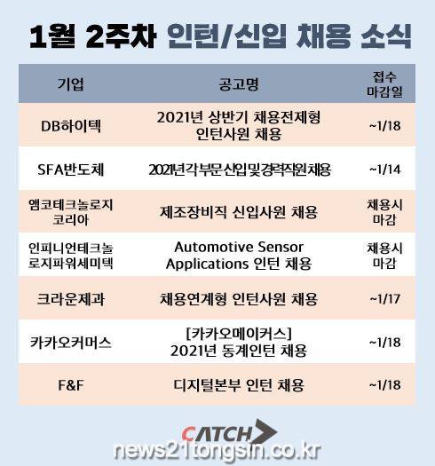 11일 취업정보사이트 캐치의 주요 기업 채용 공고에 따르면 반도체 회사인 DB하이텍, SFA반도체, 앰코테크놀로지코리아, 인피니언테크놀로지파워세미텍과 크라운제과, 카카오커머스, F&F가 신입/인턴 인재를 모집하고 있다.