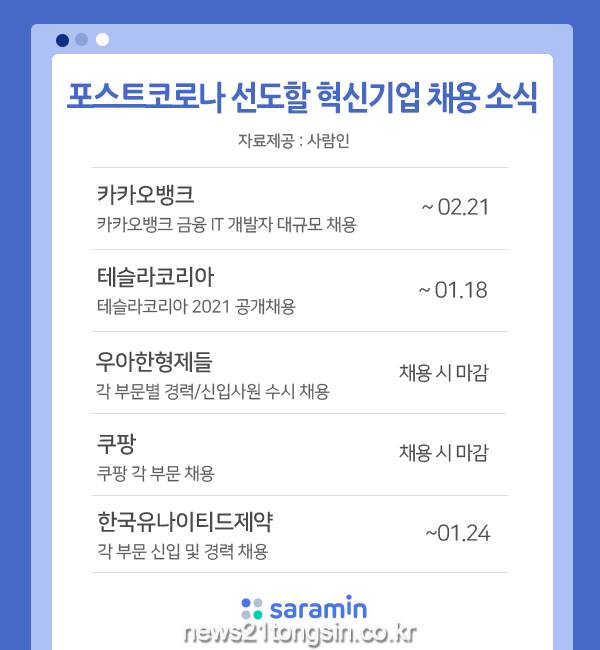 코로나 사태로 경제, 사회, 문화 전반에 커다란 변혁이 일어남에 따라 4차 산업혁명과 포스트코로나 시대를 이끌 IT, 바이오, 친환경 관련 기업들의 약진이 더욱 가속화되는 중이다. 실제로 이들 기업들은 높은 성장세에 걸맞게 대규모 공개채용을 실시하거나 지속적인 인재 수혈을 위한 상시, 수시 채용을 이어가고 있다. 구인구직 매칭플랫폼 사람인(www.saramin.co.kr, 대표 김용환)은 4차산업혁명과 포스트코로나 시대를 주도할 혁신 기업들의 채용 공고를 정리했다.