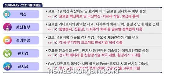 2021년 한국이 주목해야 할 주요국 공통 키워드는 백신, 바이든신정부 출범, 대규모 경기부양, 친환경, 신시장 5개라는 주장이 나왔다.