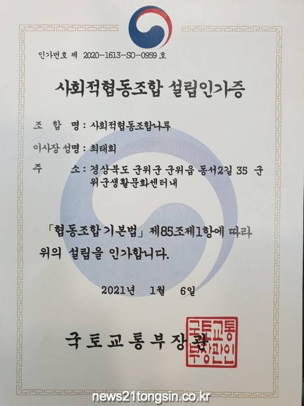 군위군은 사회적협동조합 ‘나루(이사장 최태희)’ 에 대한 최종 설립인가를 국토교통부로부터 받았다고 15일 밝혔다.