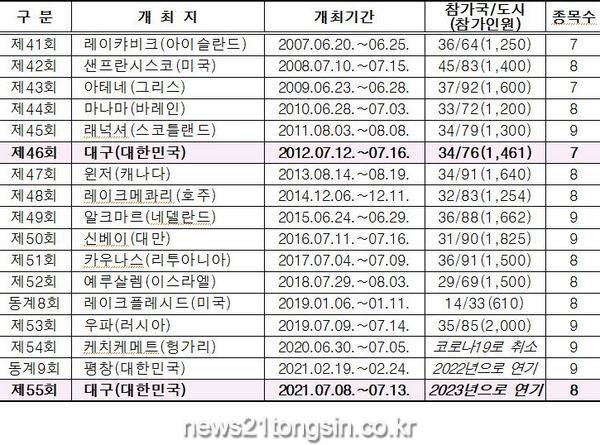 한편 대구시는 2023년 ICG대회를 코로나19를 모범적으로 극복한 대구의 국제적 위상 강화와 건강하고 활력 넘치는 도시 이미지를 세계에 알리는 기회로 적극 활용할 계획이다.
