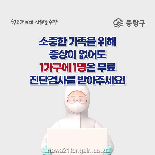 중랑구(구청장 류경기)가 구민의 안전하고 건강한 설 연휴를 위해 오는 2월 14일까지 ‘중랑구민 1가구 1명 진단검사 받기’ 캠페인을 추진한다.
