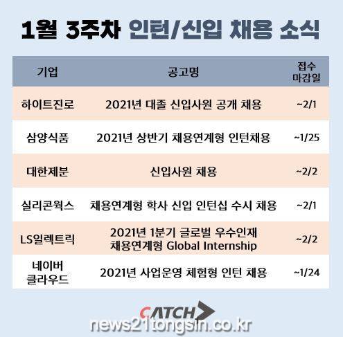 21일 취업정보사이트 캐치의 주요 기업 채용 공고에 따르면 하이트진로, 삼양식품, 대한제분, 실리콘웍스, LS일렉트릭, 네이버클라우드가 신입/인턴 인재를 모집하고 있다.