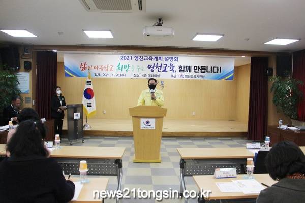 영천교육지원청(교육장 양재영)은 1월 20일(수) 2시부터 4층 대회의실에서 관내 유·초·중·고 교(원)장 42명을 대상으로 「2021 영천교육계획 설명회」를 개최하였다.