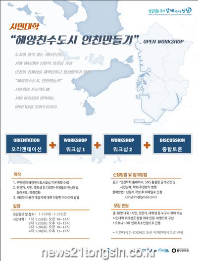 인천광역시(시장 박남춘)는 1월 23일과 30일 이틀 동안 『인천 해양친수도시조성 기본계획 수립 용역』의 일환으로 시민과 전문가가 함께 참여하는“시민대학”을 개최한다고 밝혔다.