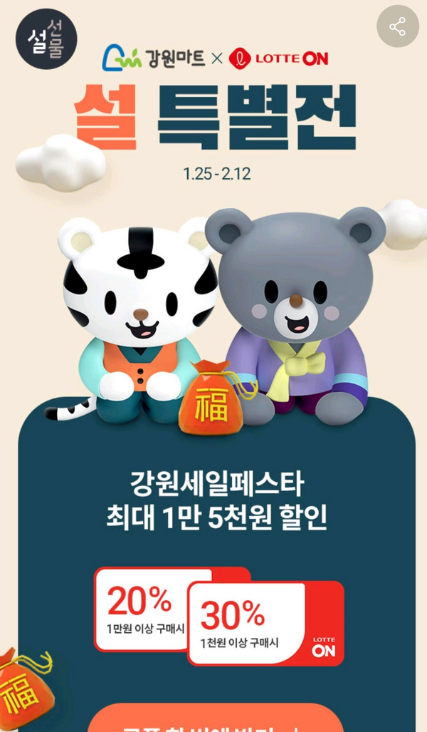 설맞이 온라인 특판전은 1. 25.(월)~ 2. 12.(금)까지 진행되며 롯데ON 브랜드관에 입점하는 강원마트를 통해 강원도 우수 농‧특산물 600여개 품목이 롯데ON에서 전국의 소비자들에게 홍보 및 판매된다.