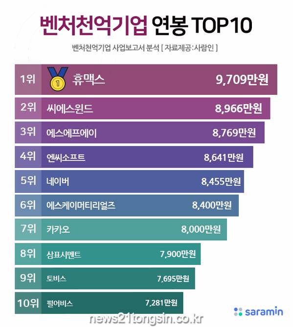 1위인 휴맥스의 1인당 평균 급여(연봉·수당·성과급 등 포함 실지급액 기준, 천단위 이하 반올림)는 9,709만원으로 1억원에 육박했다. 다음으로 △씨에스윈드(8,966만원) △에스에프에이(8,769만원) △엔씨소프트(8,641만원) △네이버(8,455만원) △에스케이머티리얼즈(8,400만원) △카카오(8,000만원) △삼표시멘트(7,900만원) △토비스(7,695만원) △펄어비스(7,281만원) 가 상위 10개사에 들었다.