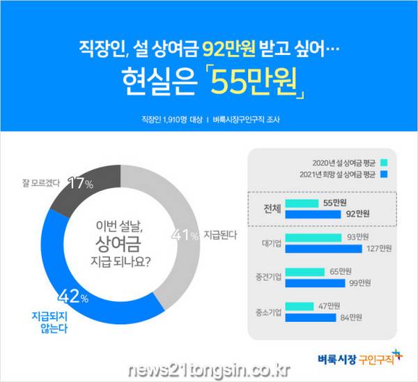 생활밀착일자리를 제공하는 벼룩시장구인구직(대표 장영보)이 직장인 1910명을 대상으로 ‘설 상여금’에 대해 설문조사를 진행한 결과, 응답자의 42%가 ‘회사에서 상여금이 지급되지 않는다’고 답했다. 대기업(67.2%)과 중견기업(55.5%)에 근무하는 직장인의 경우 ‘지급된다’는 답변이 더 많았으며 중소기업 재직자의 경우 절반에 가까운 49.5%가 ‘지급되지 않는다’고 답했다.