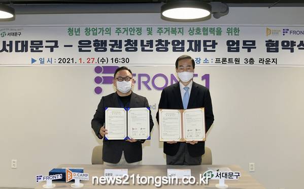 서대문구가 스타트업(창업초기기업) 청년들의 주거 안정을 위해 1월 27일 오후 마포구 공덕동 소재 ‘프론트원(FRONT1)’ 3층 라운지에서 (재)은행권청년창업재단(센터장 김홍일)과 업무협약을 맺었다.