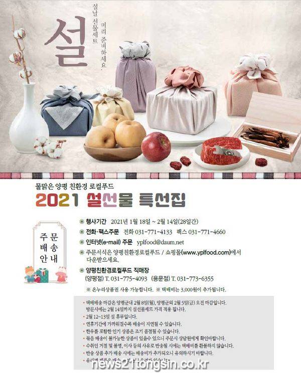 양평군은 지난 28일 신축년 설 명절을 맞이하여 국내 자매·우호도시에 농·특산물 판매 홍보로 비대면 교류의 장을 마련하였다.