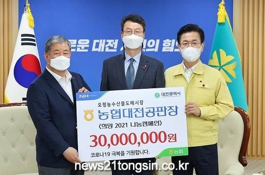 농협대전공판장은 28일 오전 시청 응접실을 찾아 취약계층 지원을 통한 지역사회 공헌을 위해 사랑의 성금 3,000만원을 기탁했다.