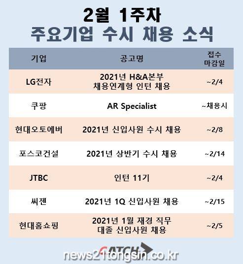 1일 취업정보사이트 캐치 주요 기업 채용 공고에 따르면 LG전자, 쿠팡, 현대오토에버, 포스코건설, JTBC, 씨젠, 현대홈쇼핑에서 신입·인턴사원 인재를 모집하고 있다.