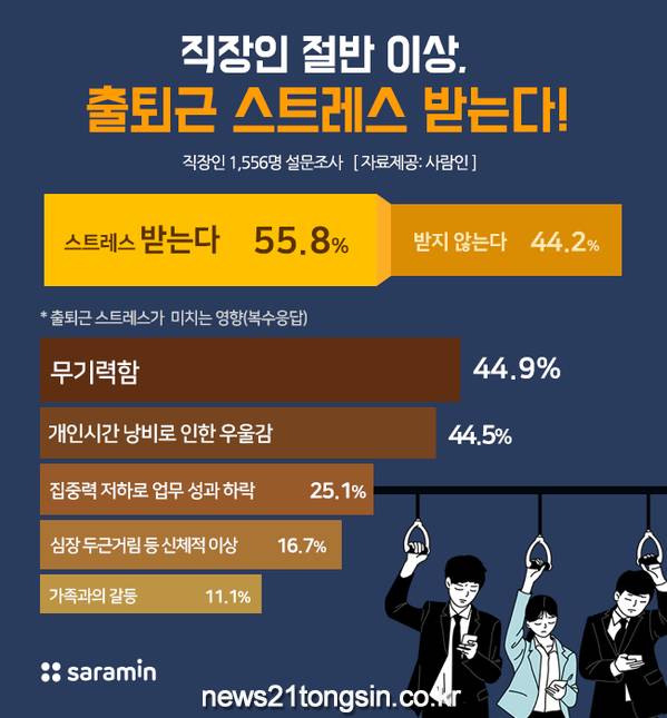 구인구직 매칭 플랫폼 사람인(www.saramin.co.kr, 대표 김용환)이 직장인 1,556명 대상으로 ‘출퇴근거리 스트레스와 업무 영향’에 대해 조사 한 결과 55.8%가 ‘평소 출퇴근시간에 스트레스를 느낀다’고 답했다. 이 중 절반은 ‘매일 출근할 때마다 느낀다’(50%)고 답했다. 이른바 ‘출퇴근 지옥’에 시달리고 있는 것이다.