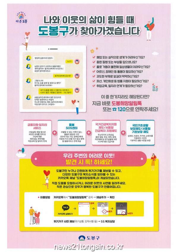 도봉구(구청장 이동진)는 코로나19 장기화 등으로 생활상의 어려움이 있으나, 노출을 꺼리는 위기가구를 찾아 지원하기 위해 2020년 12월부터 비대면 상담창구인 카카오톡 채널 ‘도봉희망알림톡’을 운영하고 있다.