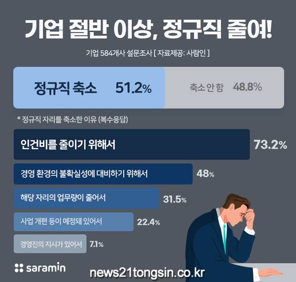 구인구직 매칭 플랫폼 사람인이 기업 584개사를 대상으로 ‘정규직원 축소 현황’을 조사한 결과, 절반이 넘는 51.2%가 ‘정규직을 줄였거나 줄일 것’이라고 밝혔다.