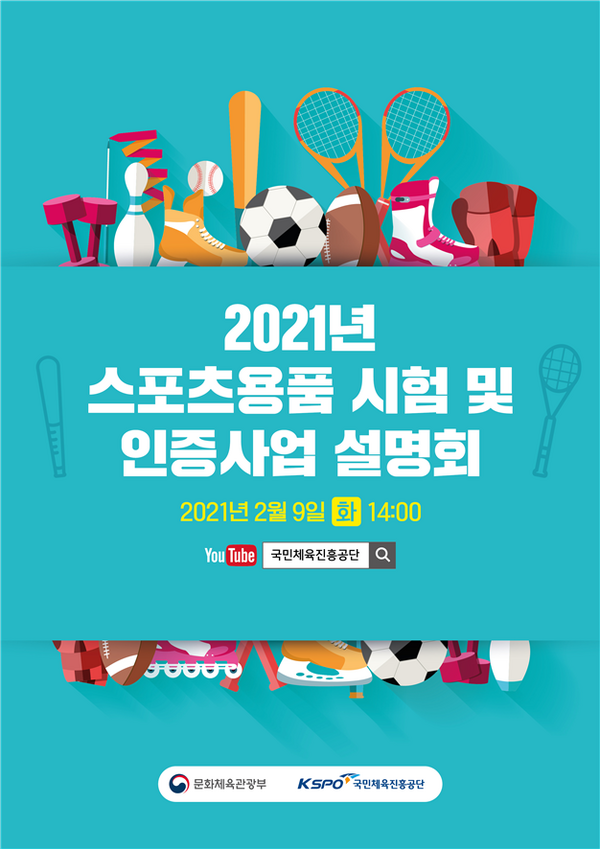문화체육관광부(장관 박양우, 이하 문체부)는 국민체육진흥공단(이사장 조재기)과 함께 2월 9일(화) 오후 2시 ‘2021년 스포츠용품 시험 및 인증사업’ 온라인 설명회를 개최한다.