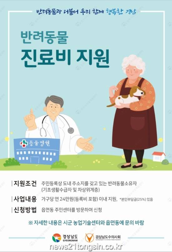 경남도와 경상남도수의사회는 신청조건, 지원내용, 신청방법 등을 담은 홍보물을 공동으로 제작해 도내 읍면동 주민센터 및 동물병원에 배포·게시하고, 도 및 18개 시군 누리집에도 관련 홍보물을 게시할 예정이다.