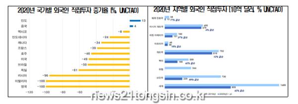 ‘20년 세계 외국인 직접투자가 전년대비 42.3% 감소한 859억 달러를 기록한 가운데 인도가 13%, 중국은 4% 증가한 것으로 나타났다. 인도의 경우 구글이 작년 7월 100억달러 규모의 인도 디지털 인프라 구축 투자계획을 발표하는 등 글로벌 ICT 기업의 디지털 인프라 투자가 늘어났고, 중국의 경우 서비스․첨단기술 분야로 외국인 투자자본의 유입이 증가한 데 따른 것으로 분석된다.