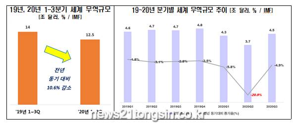 지난 해 2월까지 중국 등 아시아에 국한되었던 코로나19가 3월부터 미국, 유럽 등 전 세계로 확산되면서, 이에 따른 각국 경제봉쇄 조치로 20년 1~3분기 세계 교역규모는 전년동기 대비 10.6% 감소한 12조 5,168억 달러를 기록하였다. 다만, IMF는 [2021 세계경제전망(‘21.1)]을 통해 작년 세계무역이 3분기부터 회복세를 보임에 따라 연간으로는 전년 대비 9.6% 감소할 것으로 추정하였다.