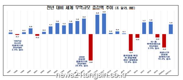 처럼 세계교역이 10%대로 큰 폭의 역성장을 한 것은 2008년 글로벌 금융위기 당시 교역규모가 전년대비 –23.6% 감소하고, 2015년 중국경제 부진으로 –12.9% 감소한 데 이어 1997년 글로벌 외환위기 이후 세 번째다.