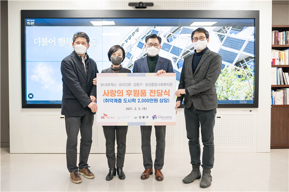 SK네트웍스는 ‘한끼 나눔 온(溫)택트 프로젝트’ 일환으로 코로나19와 경기 불황으로 한층 더 어려운 고독사 위험 홀몸 어르신 1인 가구의 겨울나기를 위해 강동구에 성금 2천만원을 기부했다.