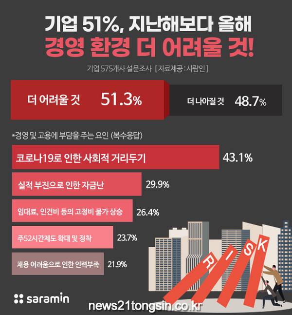 기업들이 보는 2021년 전망은 암울했다. 구인구직 매칭 플랫폼 사람인이 기업 575개사를 대상으로 ‘2021년 경영전망’과 관련해 설문조사 한 결과 51.3%가 ‘지난해 보다 더 어려워 질 것’이라고 답했다.