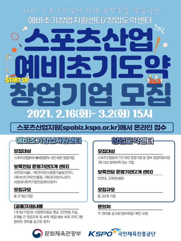 문화체육관광부는 국민체육진흥공단과 함께 스포츠산업의 유망 사업모델을 새롭게 발굴하고 코로나19로 어려움을 겪는 스포츠기업을 지원하기 위해 ‘2021년 스포츠산업 창업기업 지원 사업’에 참여할 기업을 2월 16일(화)부터 3월 2일(화)까지 모집한다고 밝혔다.