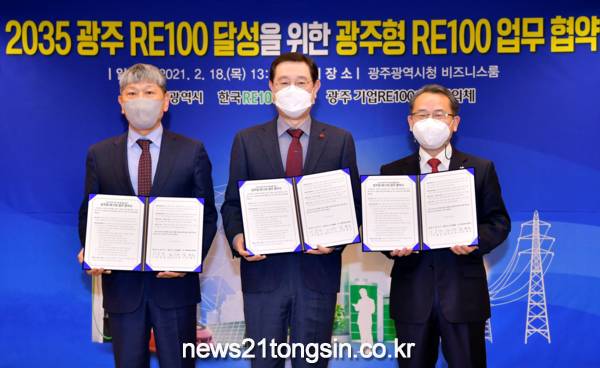 광주광역시는 18일 오후 시청 비즈니스룸에서 한국RE100위원회, 광주기업RE100추진협의체와 ‘광주형 RE100 업무협약’을 체결했다. 협약식에는 이용섭 광주시장, 김광란 광주시의회 그린뉴딜특별위원회 위원장, 진우삼 한국 RE100위원회 위원장, 김형순 광주기업RE100추진협의체 대표, 이명주 명지대학교 교수 등이 참석했다.