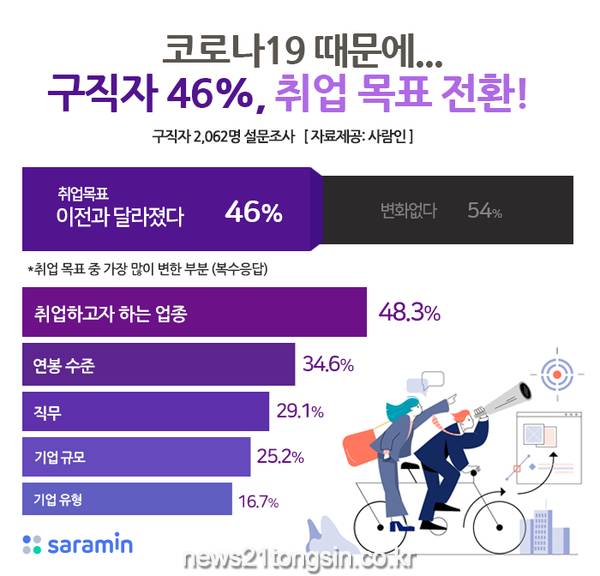 지난해 코로나19로 인해 취업을 준비하는 구직자들의 속이 탔다. 그 여파가 아직도 지속되는 가운데 구인구직 매칭 플랫폼 사람인(www.saramin.co.kr 대표 김용환)이 구직자 2,062명에게 ‘2021년 취업목표 변화’에 대해 설문조사를 실시했다. 그 결과 응답자의 46%가 ‘취업목표가 이전과 달라졌다’고 답했다. 절반 가까이 되는 수치다.