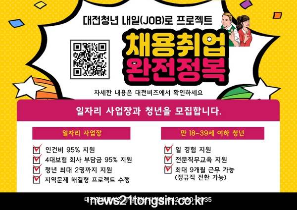 대전시 이현미 청년가족국장은 “기존 단순형 매칭형 일자리사업은 지역 청년 인재들의 성장에 한계가 있고, 사업참여 기업·단체 역시 적절한 인재를 찾지 못했다”며, “대전청년 내일(JOB)로 프로젝트 사업이 그 한계를 벗어나, 지역청년과 기업에 큰 도움이 될 것으로 기대되는 바 청년당사자 및 사업장에서 관심을 갖고 사업에 신청하여 참여하길 바란다”고 말했다.