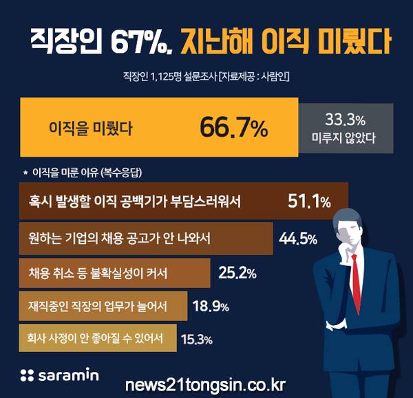 구인구직 매칭 플랫폼 사람인(www.saramin.co.kr, 대표 김용환)이 이직 의향이 있는 직장인 1,125명을 대상으로 ‘지난해 이직을 미뤘는지 여부’를 조사한 결과, 66.7%가 ‘이직을 미뤘다’고 답했다.
