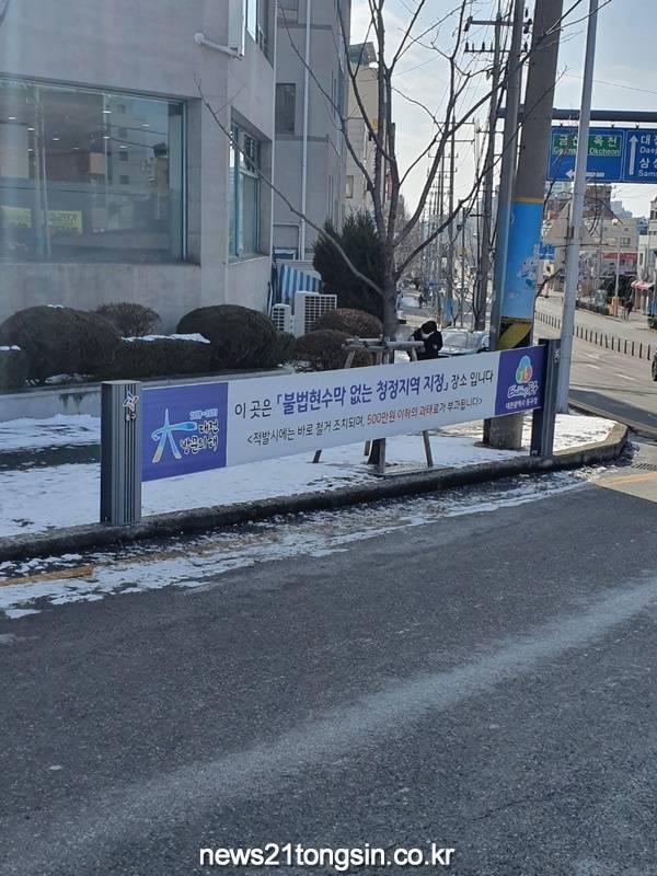 지속가능한 청정도시를 만들기 위해 지정된 ‘불법현수막 없는 청정지역’은 불법현수막 관련 상시단속을 실시하여 무관용 원칙으로 발견 즉시 철거되며, 3회 이상 불법 행위 적발 시에는 500만 원 이하의 과태료를 부과한다.