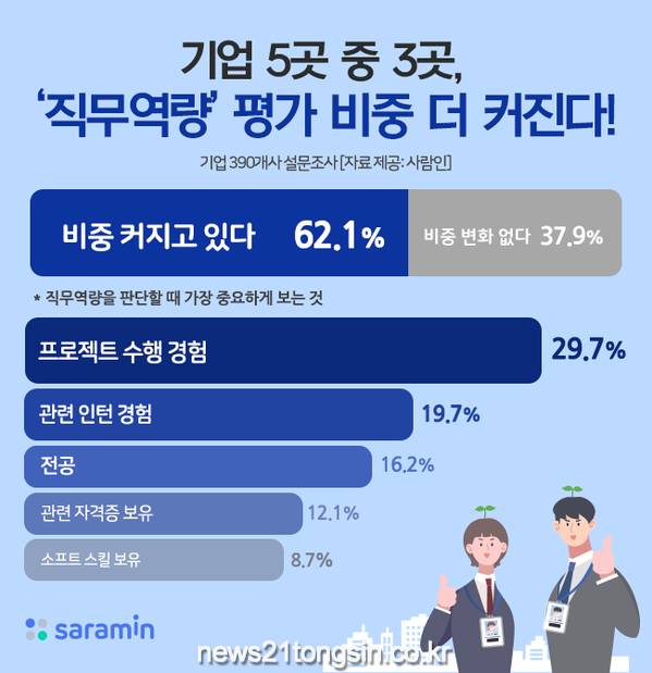 구인구직 매칭플랫폼 사람인(www.saramin.co.kr, 대표 김용환)이 기업 390개사를 대상으로 ‘직무역량 평가’에 대해 조사한 결과, 62.1%가 과거에 비해 직무역량에 대한 평가 비중이 커지고 있다고 답했다.