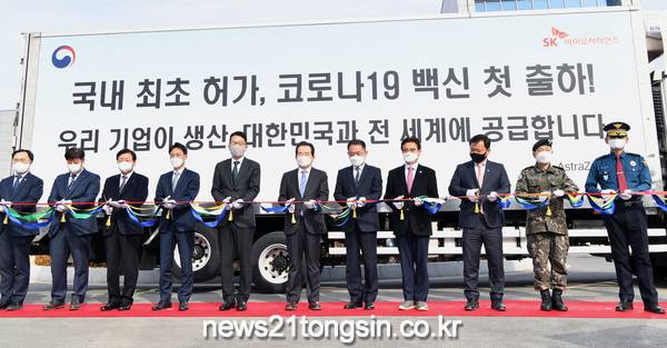 이날 첫 출하한 코로나19 백신은 영국 제약회사 아스트라제네카 백신으로 78만 7천명이 접종할 수 있는 분량이며 26일부터 전국적으로 시작되는 백신 접종 일정에 맞추기 위해 각 물류센터로 이송했다.