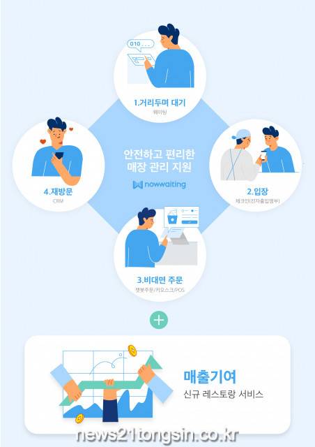 먼저, 나우웨이팅은 식당 방문 손님이 좁은 공간에 모여 대기할 필요를 없애 거리두기를 자연스럽게 실현한다. 모바일로 방역수칙 안내까지 가능해 방역과 영업상황 등 매장 소식을 실시간으로 손님과 공유함으로써 손님이 마음 놓고 매장을 이용하도록 지원한다. 확진자 발생 시에도 나우웨이팅 데이터를 활용해 민첩하게 대응할 수 있다.